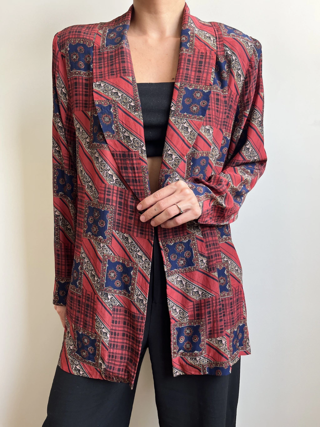 Blazer Gucci estampado vintage CGC 100% seda, com ombreiras e abotoamento único. Modelo leve e maleável, não forrado. Tamanho 48 na etiqueta, confira as medidas: