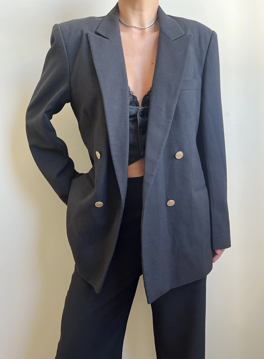 Blazer Valentino preto com botões dourados com monograma. Vintage CGC. Modelo transpassado clássico, bem estruturado, com ombreiras e lapela larga. Tecido em viscose e poliéster. Tamanho 52 - M na etiqueta, veste melhor até 46. Confira as medidas: