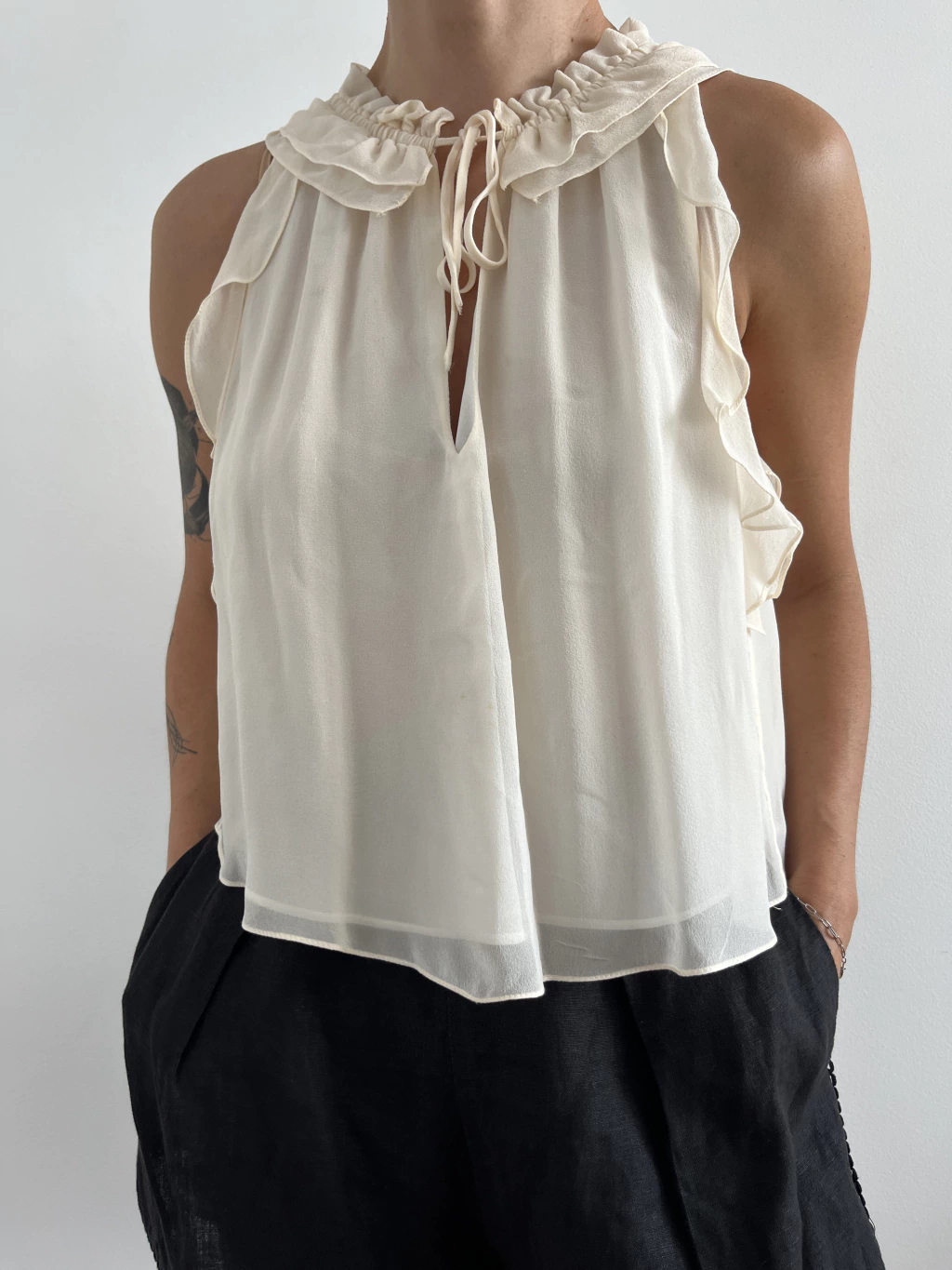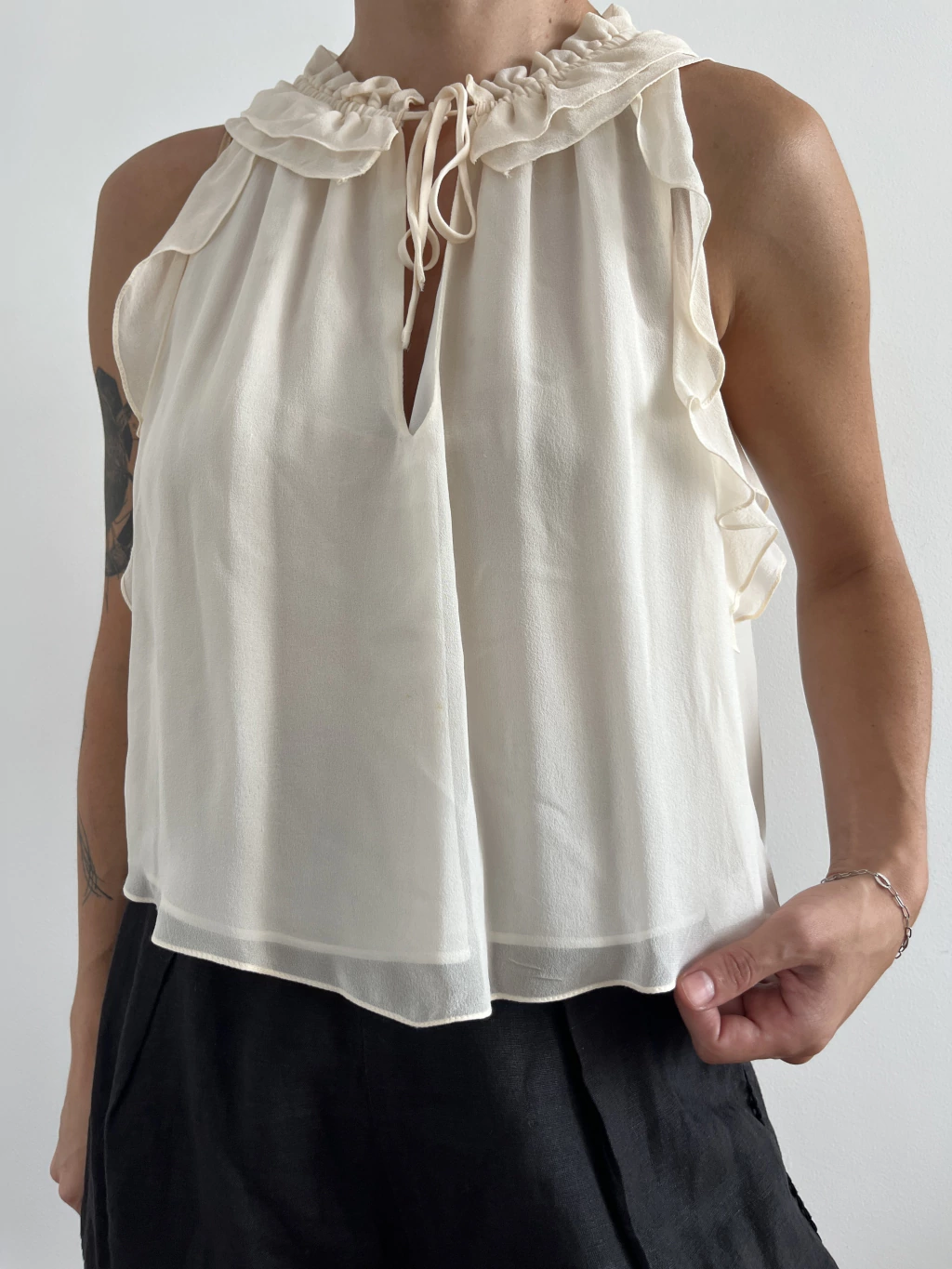 Blusa Bo.bô 100% seda offwhite, sem mangas, com babados, forrada. Tamanho 36, confira as medidas: