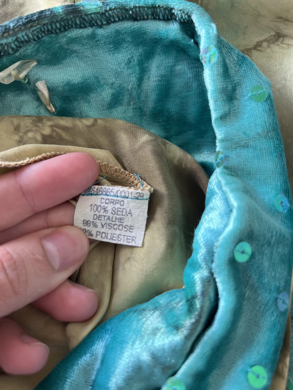 Blusa manga longa 100% seda estampada, com detalhes de veludo. Tamanho 44 na etiqueta, confira as medidas: