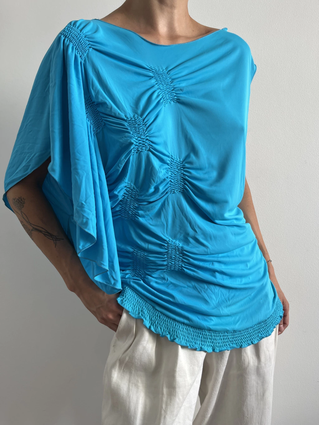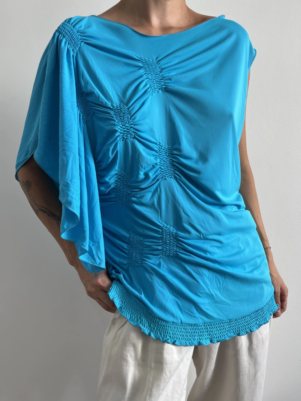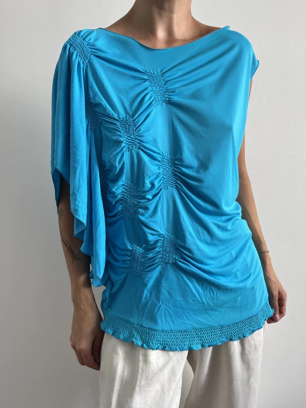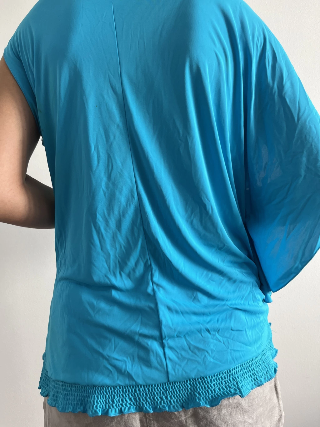Blusa azul turquesa assimétrica com franzidos, tecido tipo malha fria, 100% poliamida. Tamanho P na etiqueta, serve tamanho maior, confira as medidas: