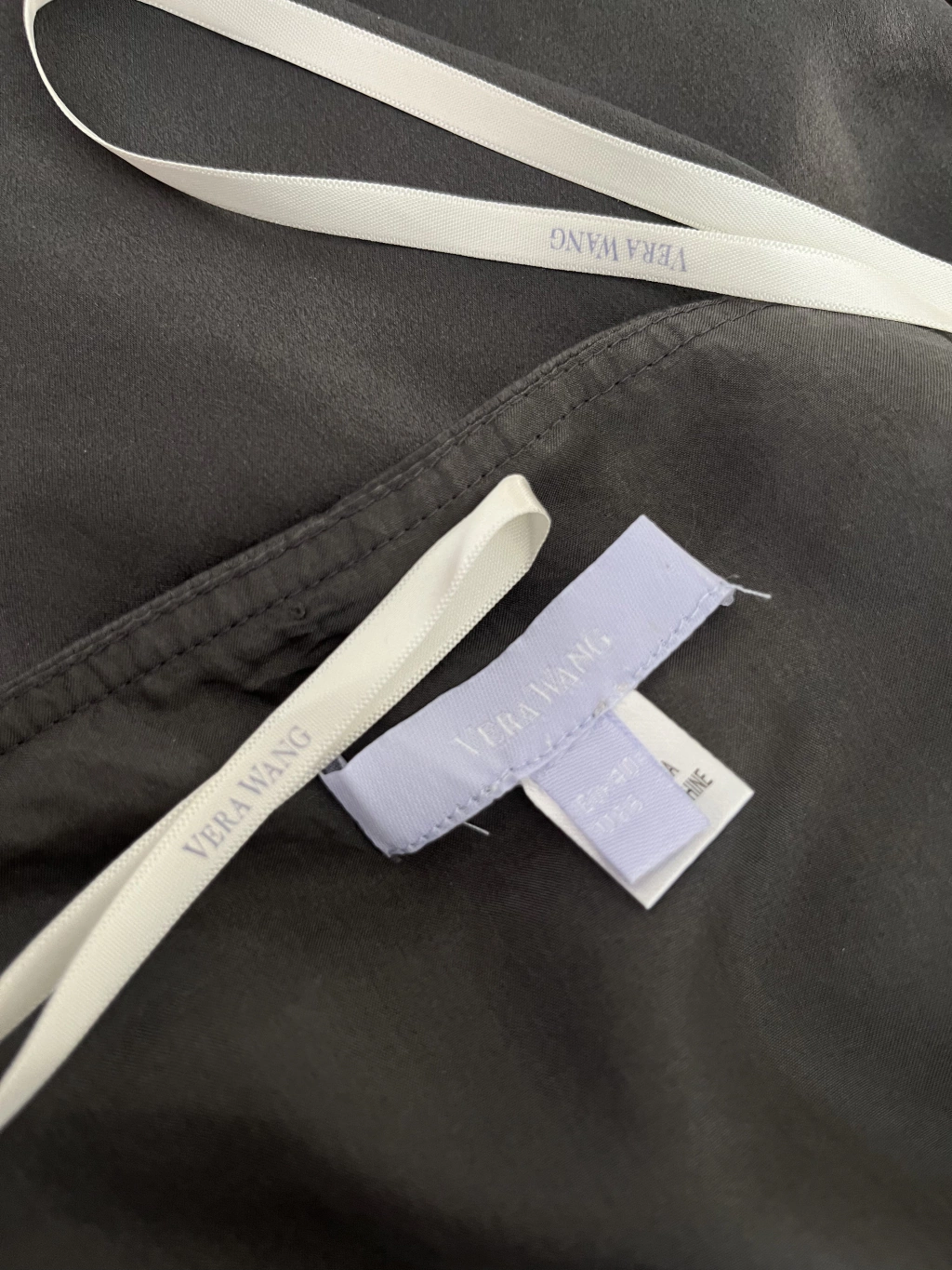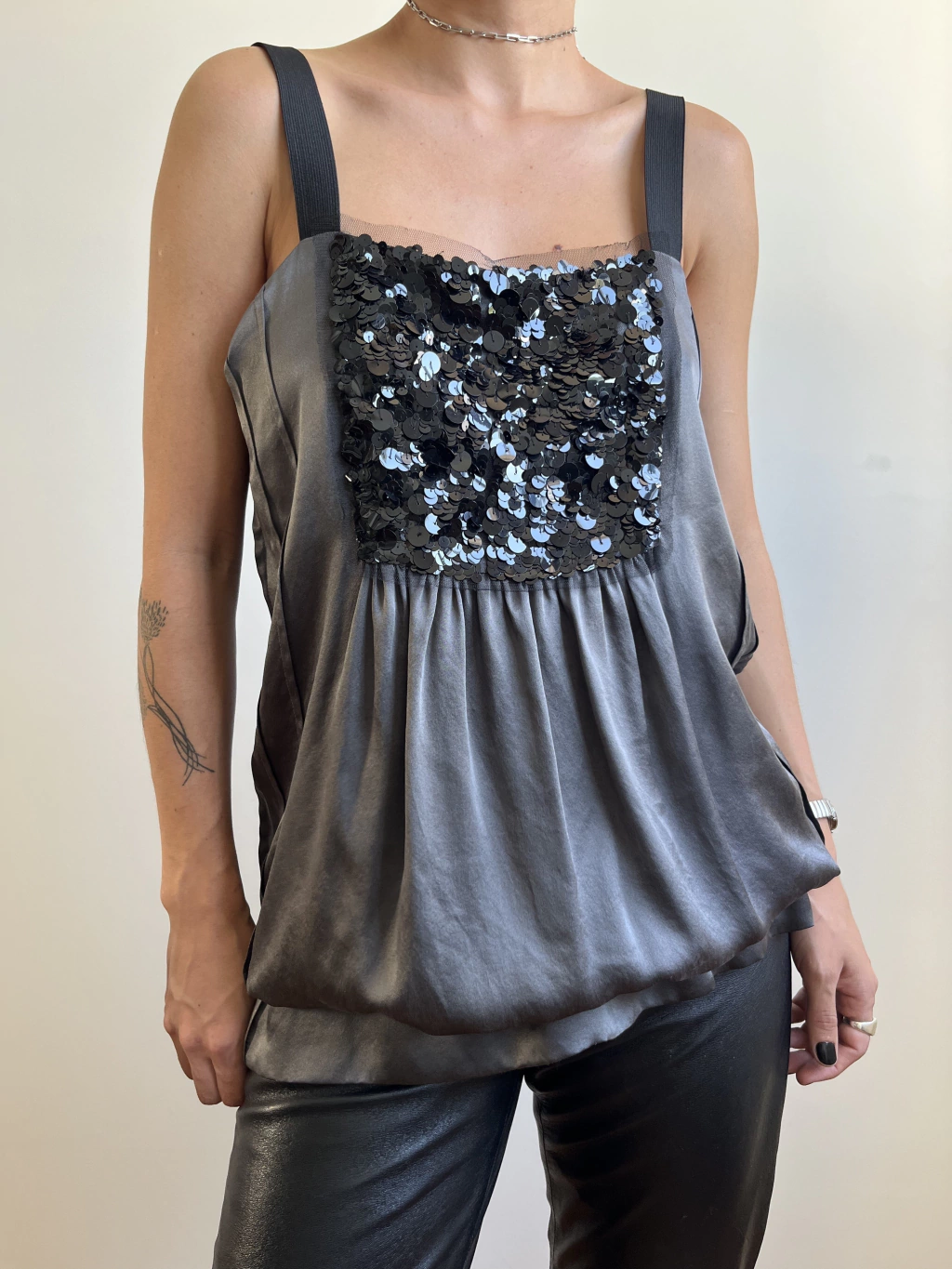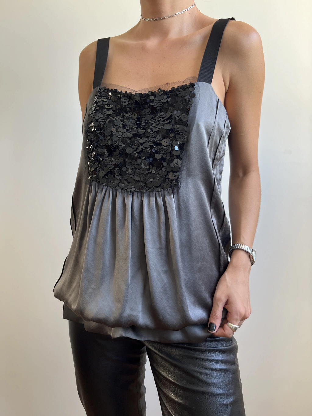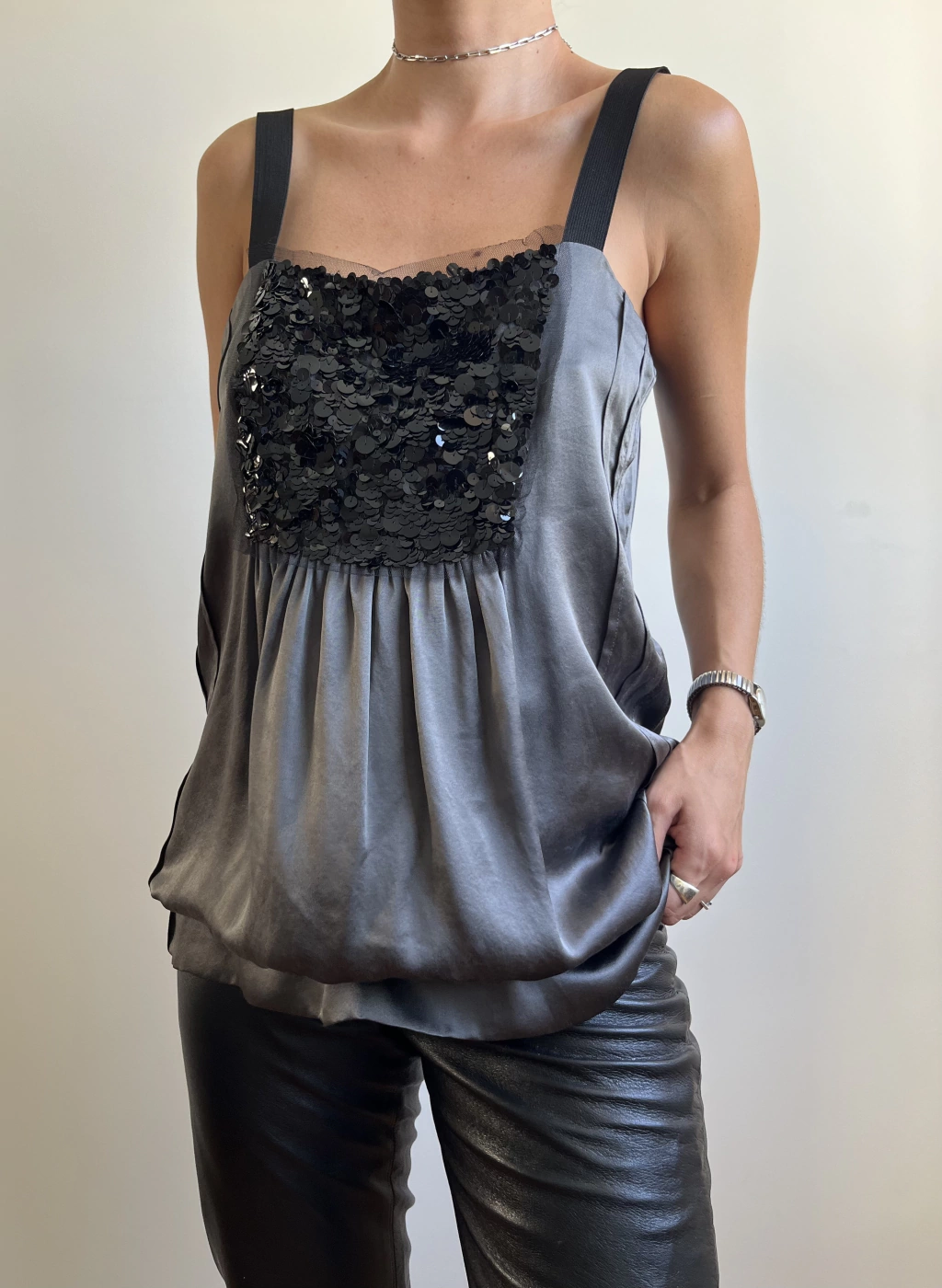 Blusa Vera Wang seda pura cinza com aplicação de paetês na frente. Modelo de alças e com elástico próximo a barra. Tamanho 40.