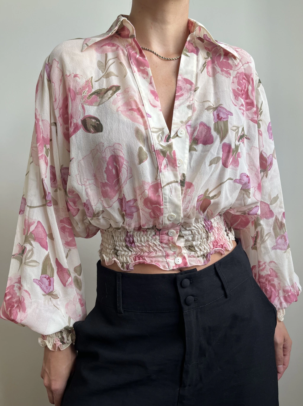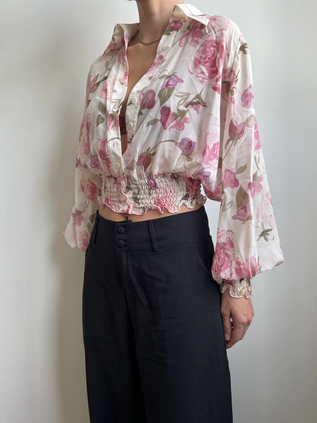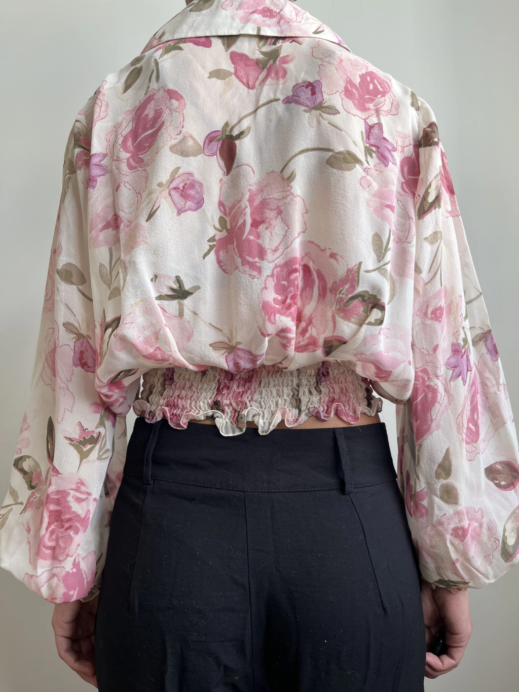 Camisa 100% seda com estampa floral, modelo cropped, com mangas bufantes e lastéx na cintura e punhos. Fecho frontal por botões. Tamanho 40.