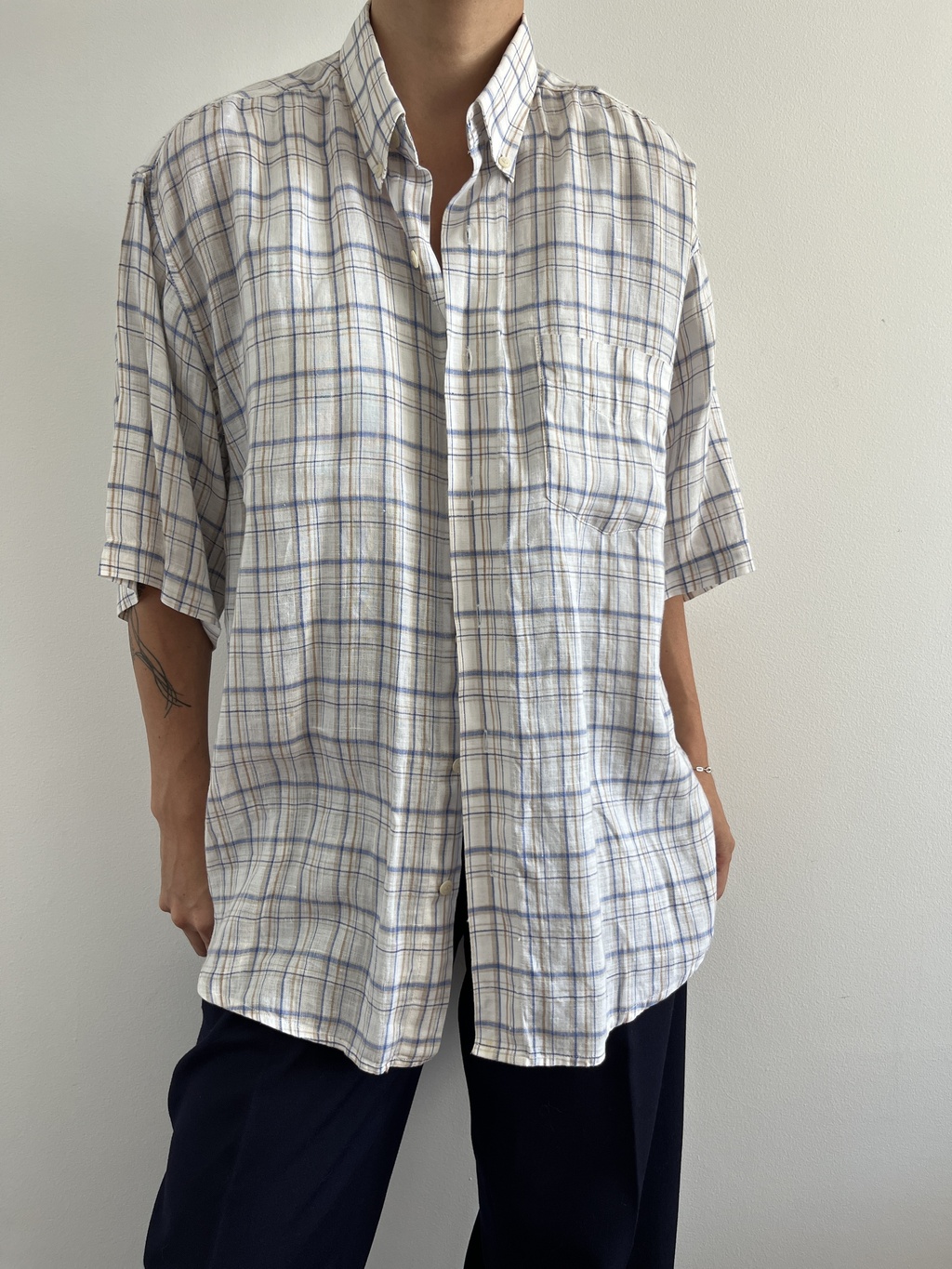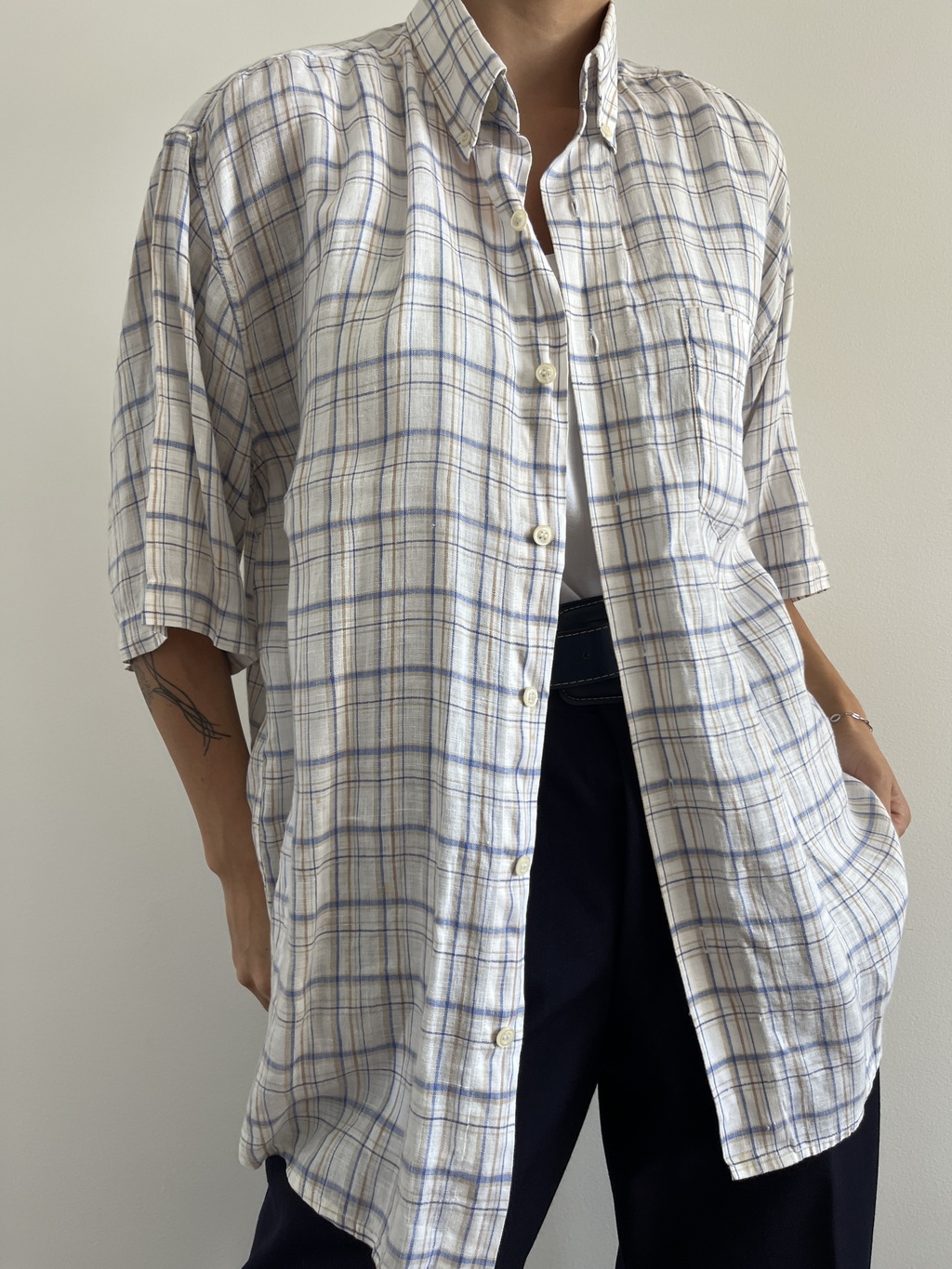 Camisa manga curta 100% linho, branca com estampa xadrez. Tamanho 4, confira as medidas: