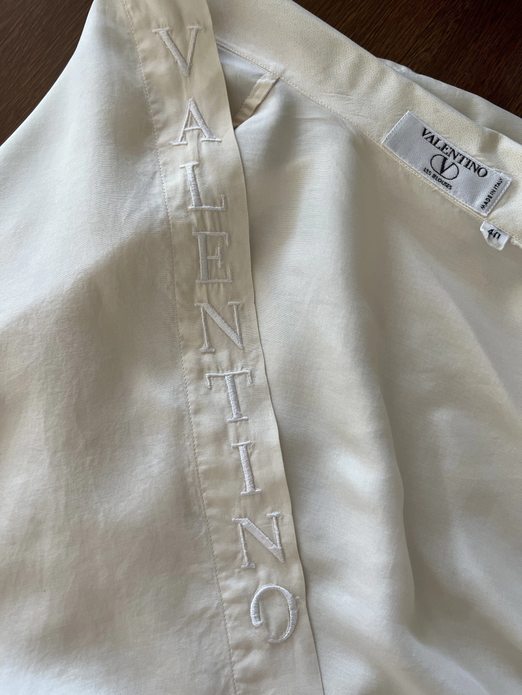Camisa Valentino vintage tom creme, com bordado com o nome da marca na frente, de usar com abotoaduras (não acompanha), está sem etiqueta de composição, mas é claramente de seda. Pequena parte da letra O bordada desmanchou, como mostram as fotos. Tamanho 40, confira as medidas: