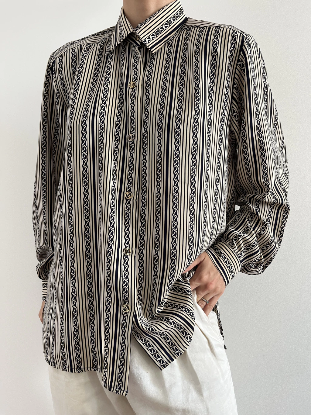 Camisa vintage estampada em bege e azul marinho, com ombreiras. Tecido em poliéster. Tamanho 46 na etiqueta, confira as medidas: