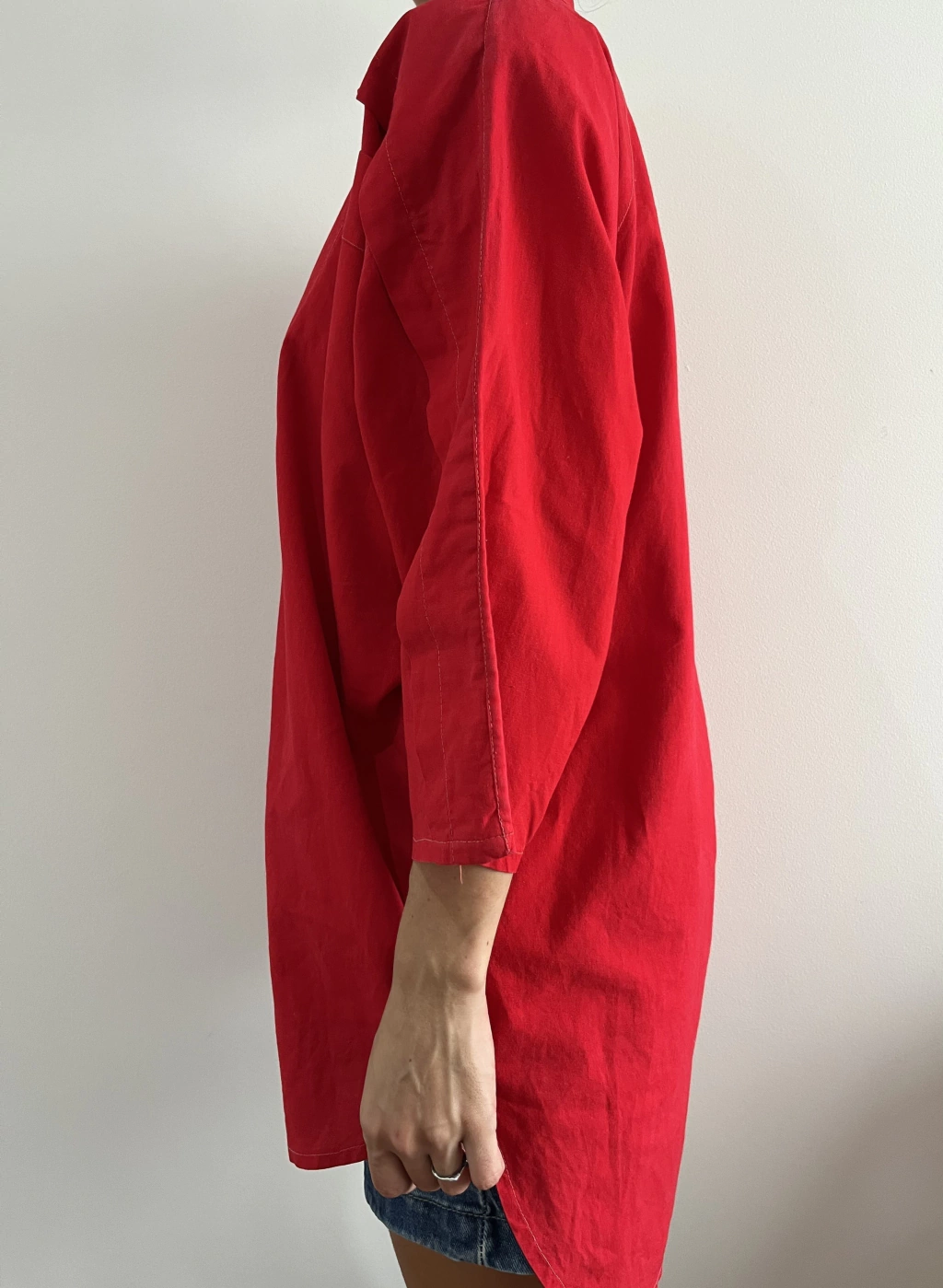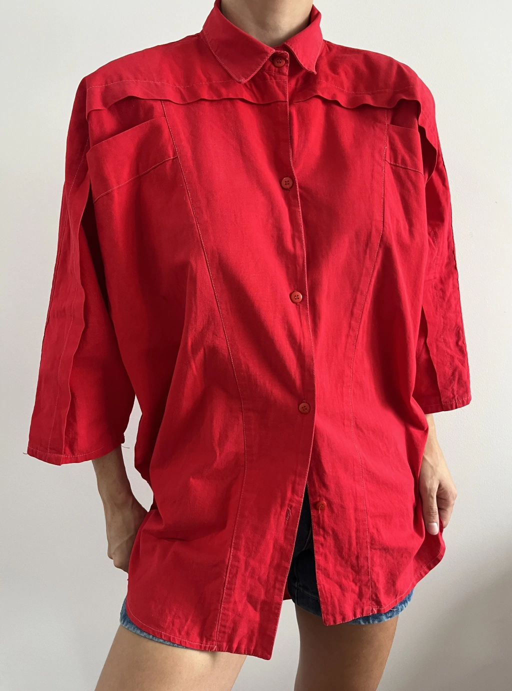 Camisa vintage vermelha, modelo com manga morcego, bolsos e ombreiras. Aparentemente em algodão. Etiqueta está apagada. Veste até G.