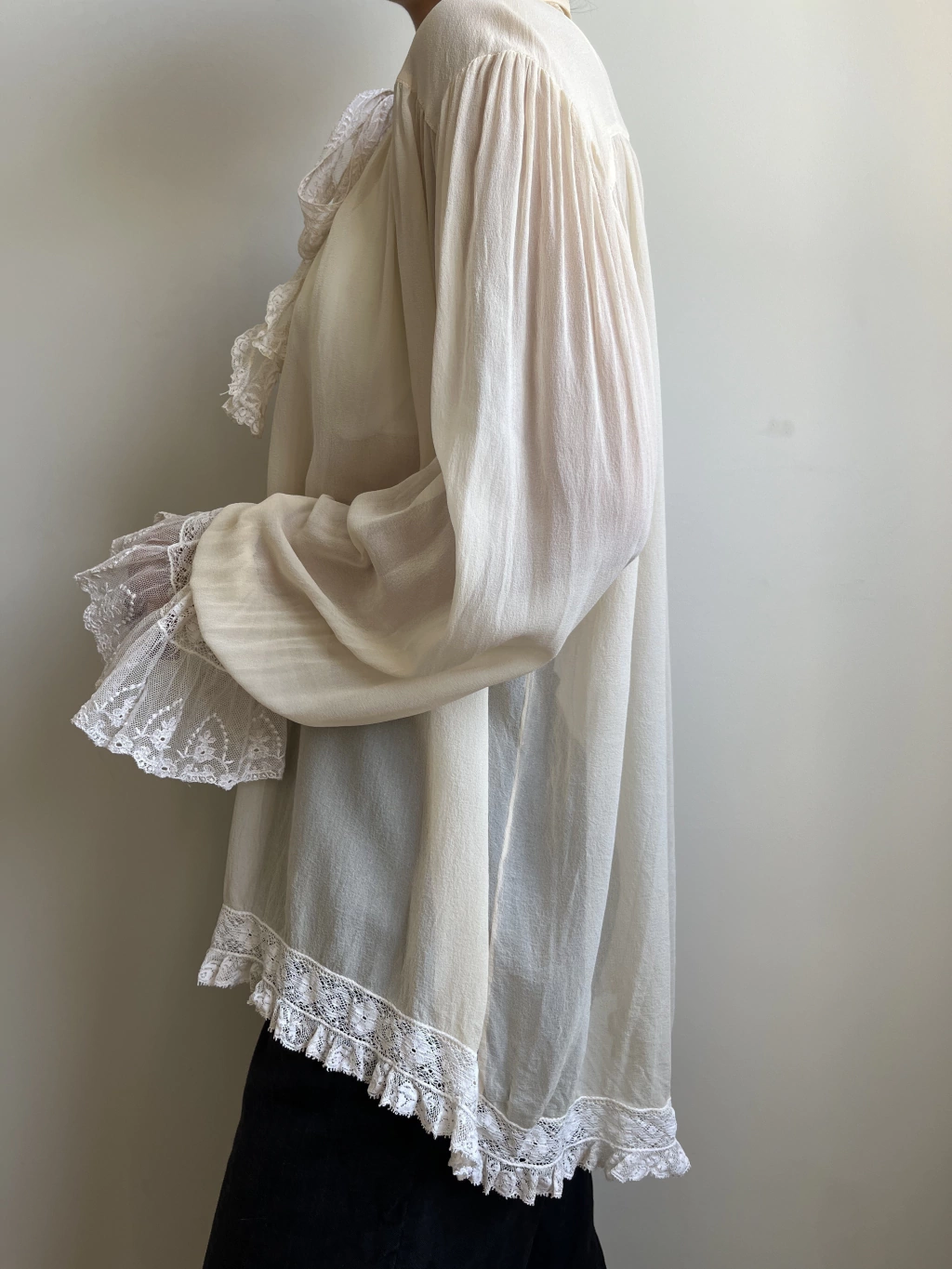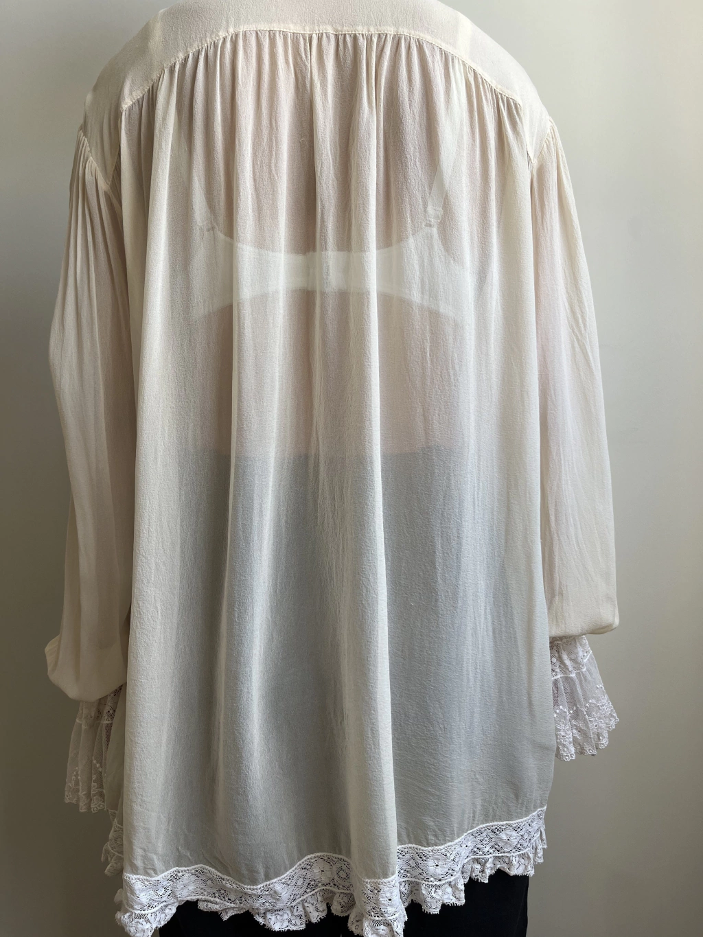 Camisa vintage estilo vitoriana tom offwhite, o tecido parece palha de seda, com detalhes de renda. Veste até G/GG. Possui minúsculo furinho próximo ao ombro, conforme foto.