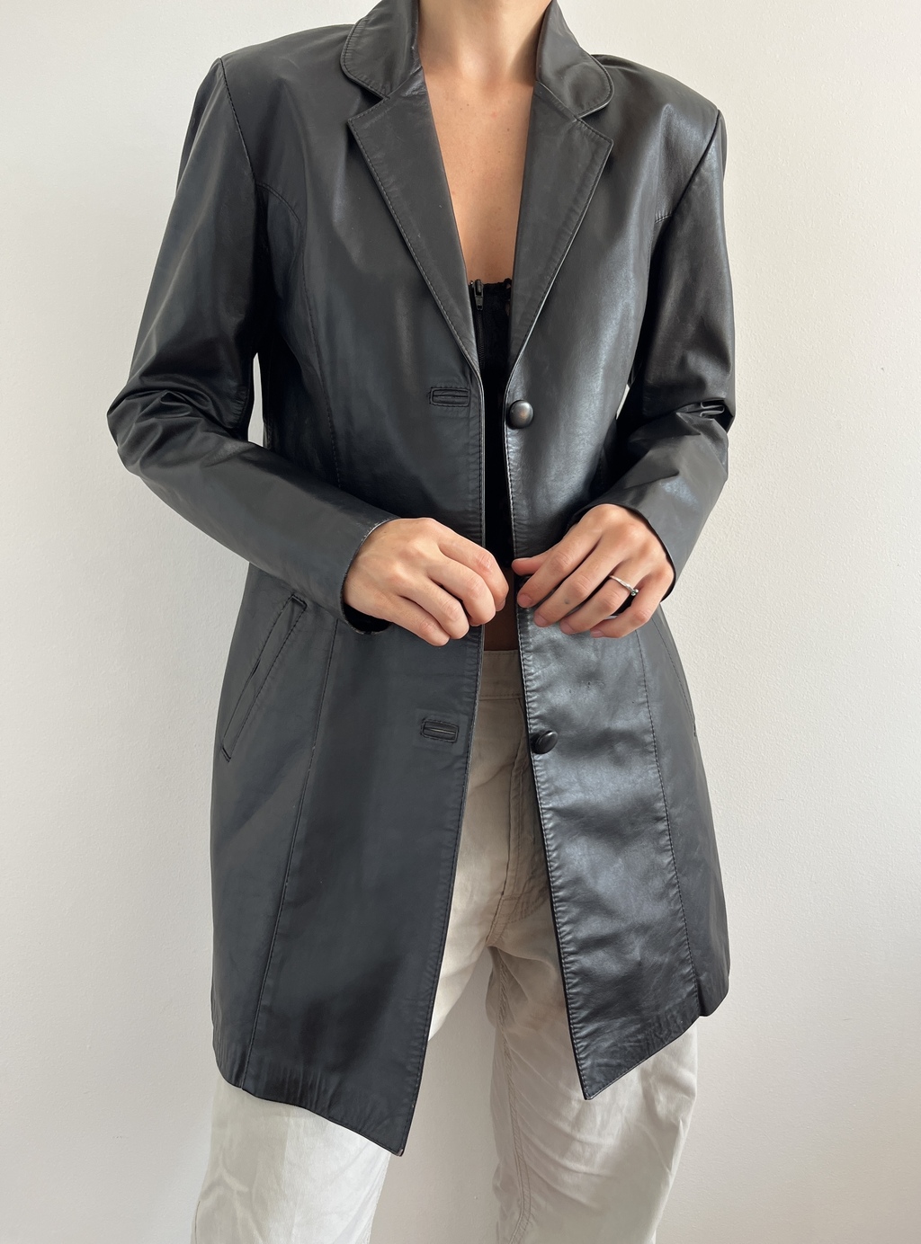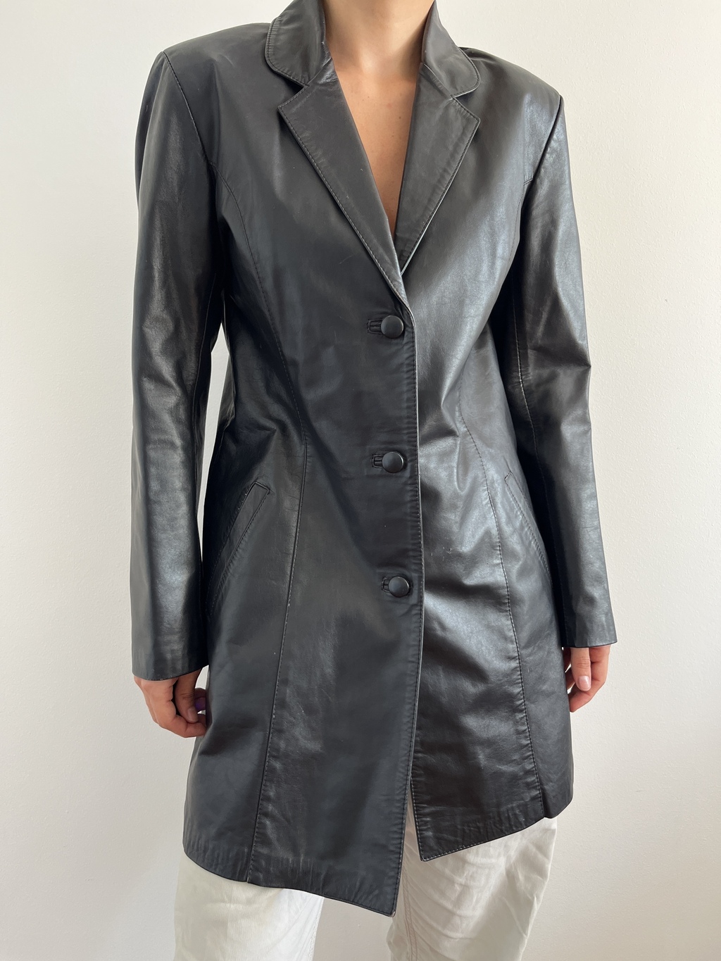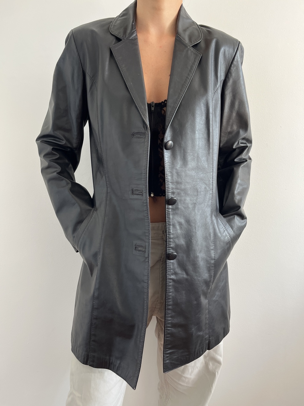 Casaco alongado em couro legítimo preto, fabricado na Argentina, forrado, com bolsos e botões revestidos. Não é muito pesado. Veste aproximadamente P/M, confira as medidas: