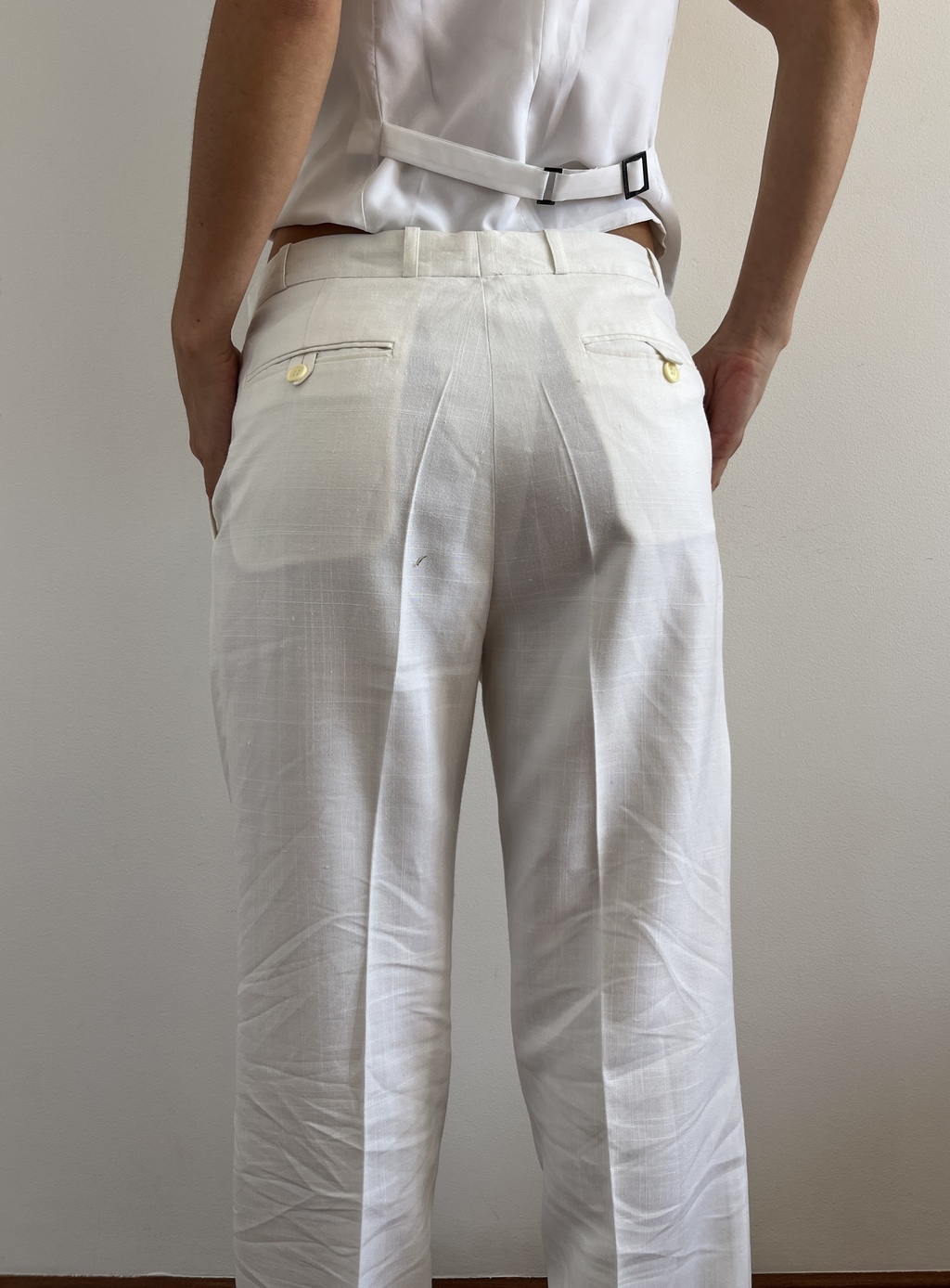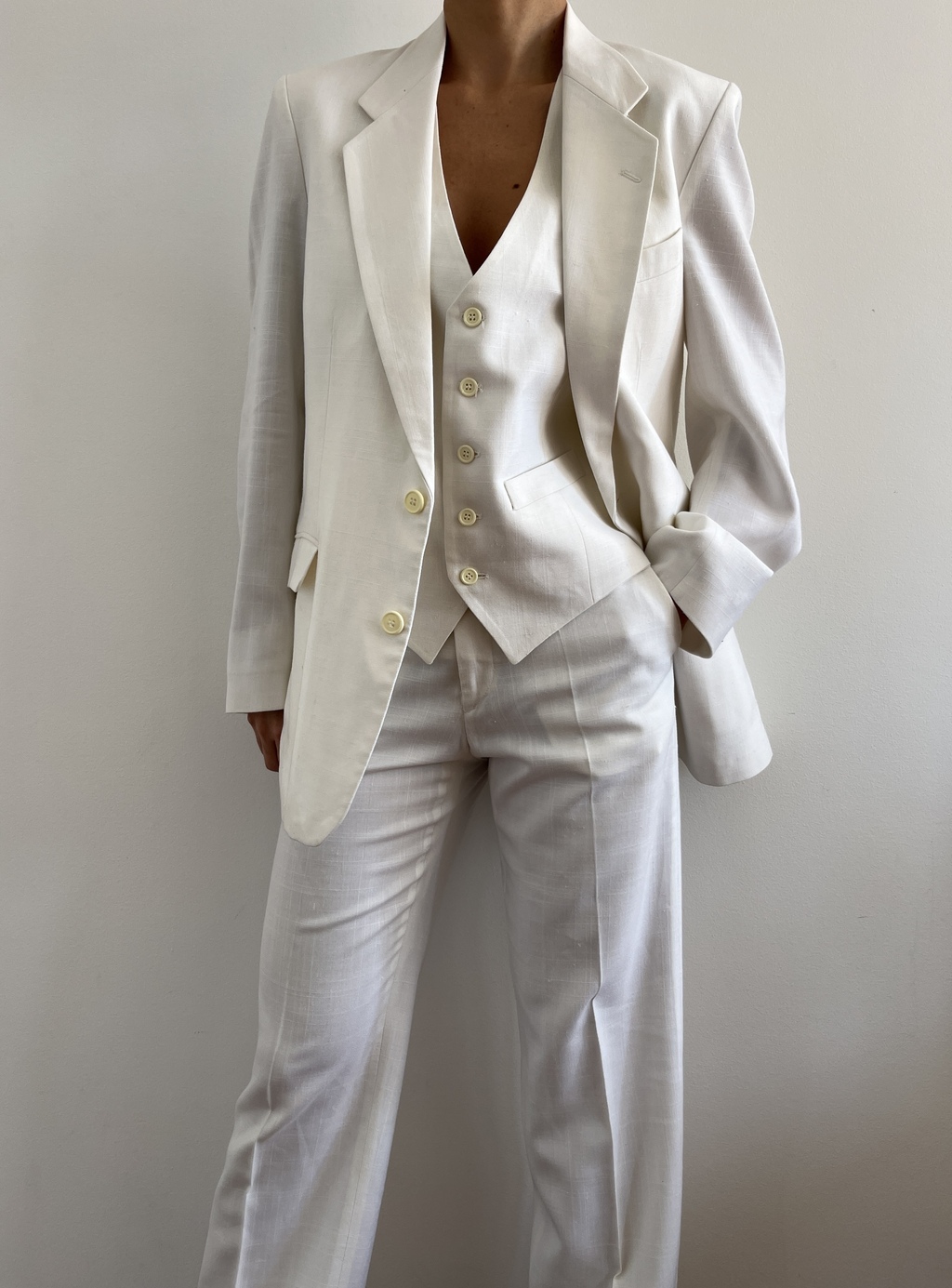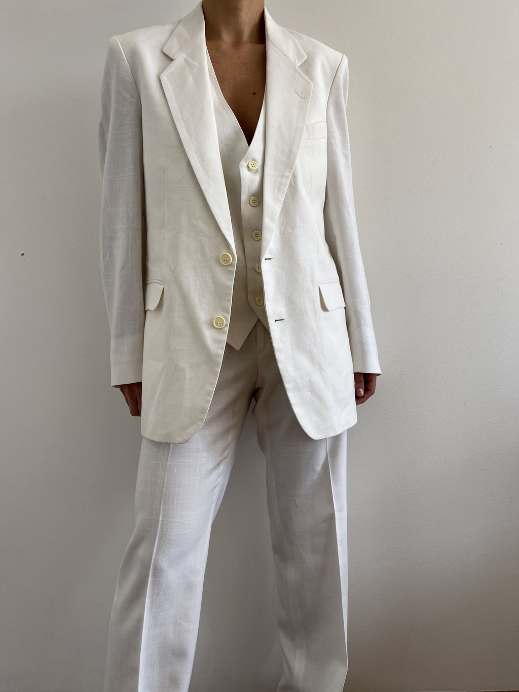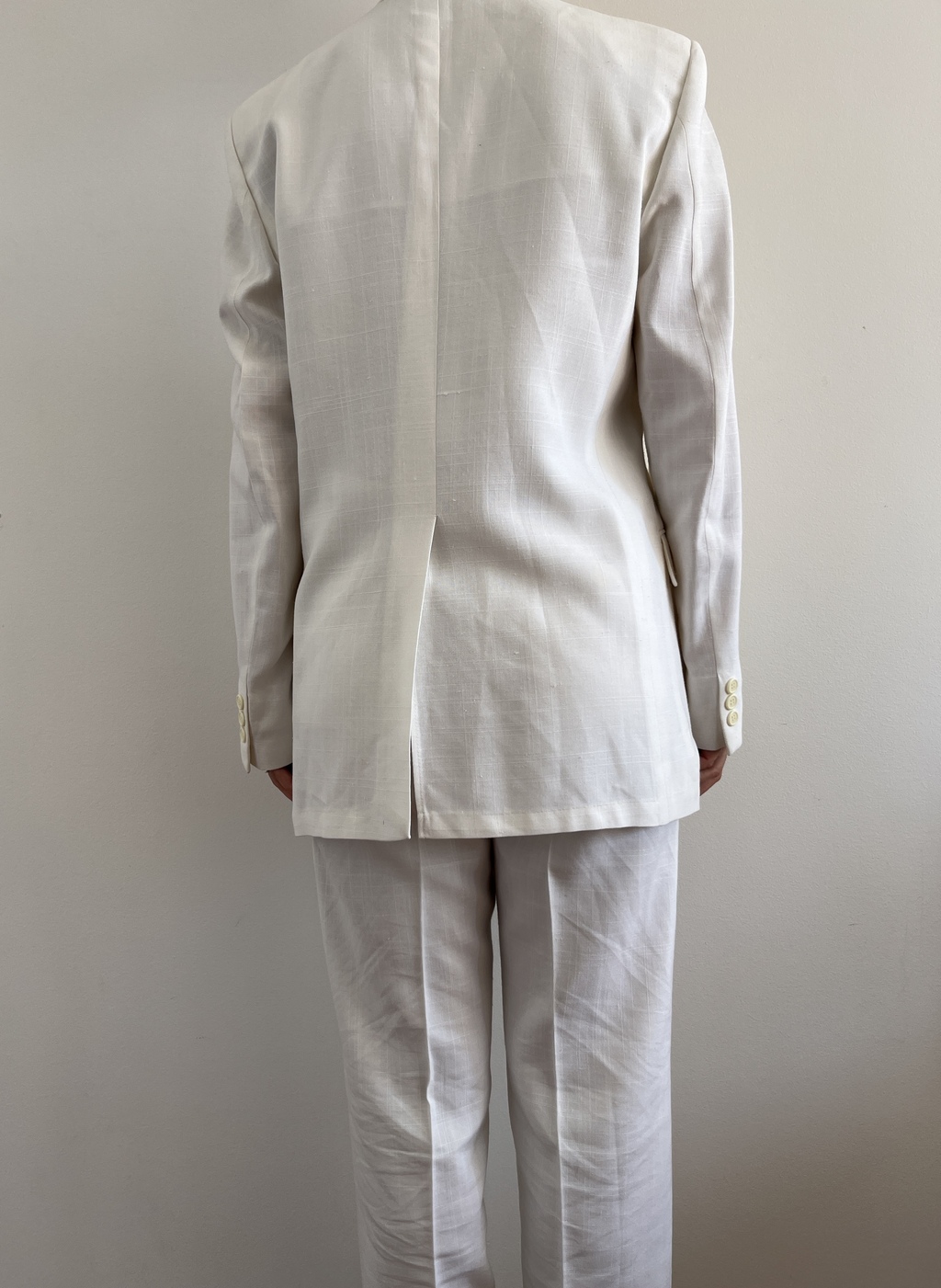 Terno vintage Camelo em linho misto tom offwhite. Blazer alongado e bem estruturado, calça reta, com cintura alta e sem pregas. Tamanho 48 na etiqueta, veste tamanho menor, confira todas as medidas.