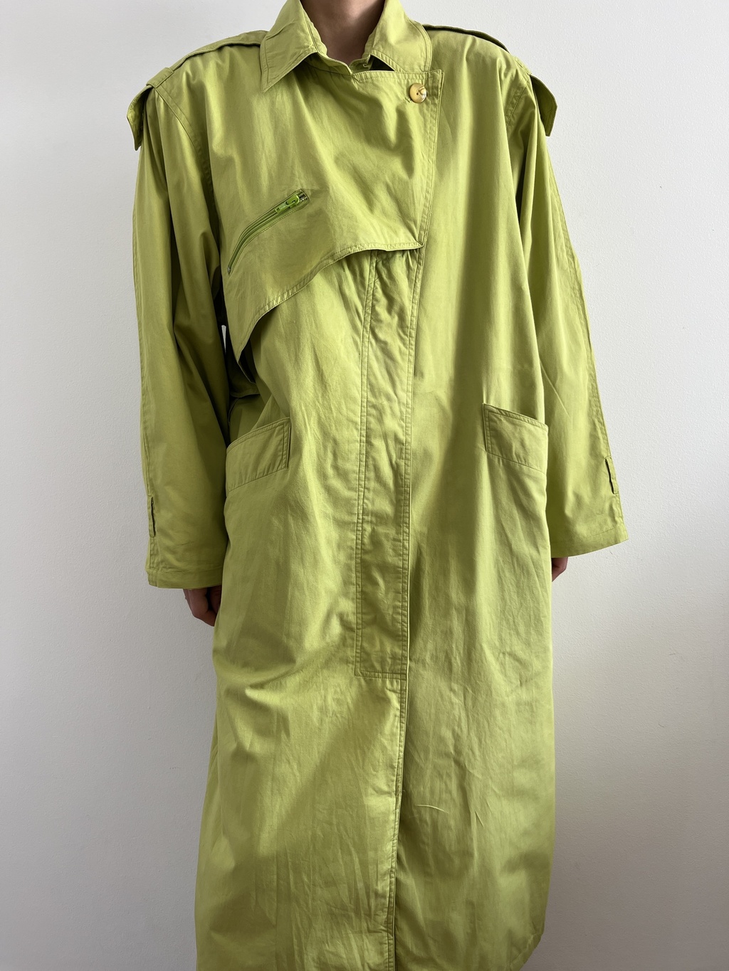 Trench coat verde limão, 100% algodão, com ombreiras. Possui pequenas manchinhas mais claras, quade imperceptiveis, conforme fotos. Veste aproximadamente G, confira as medidas: