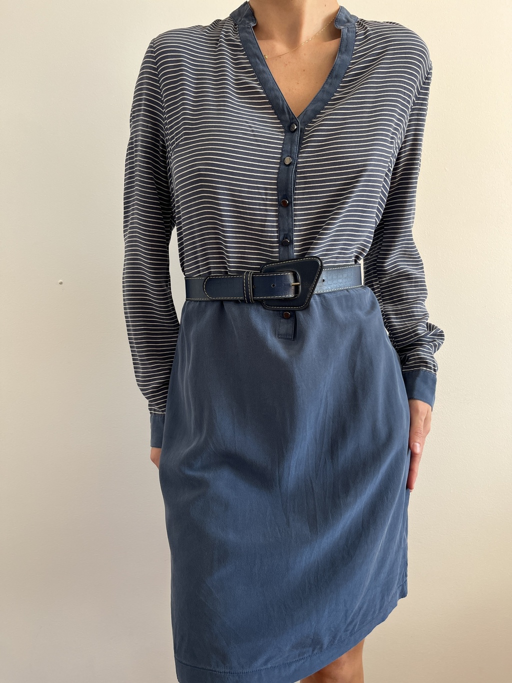 Vestido Cori em seda azul, reto, com mangas longas. Não acompanha o cinto das fotos. Tamanho 38 na etiqueta, confira as medidas: